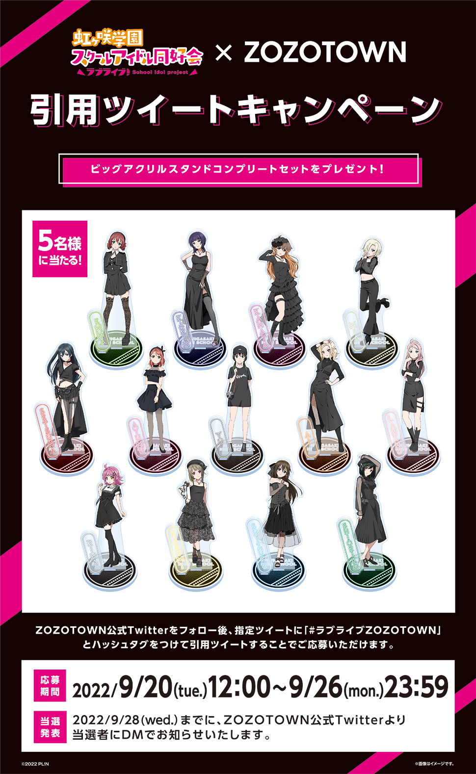 ZOZOTOWN公式Twitterアカウント(@zozojp)をフォローいただき、指定ツイートに「#ラブライブZOZOTOWN」とハッシュタグをつけて引用ツイートいただいた方の中から抽選で、ビッグアクリルスタンドコンプリートセットを5名様にプレゼントいたします。